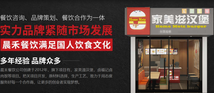 晨禾餐饮公司创建于2012年,旗下项目有,家美滋汉堡,卤福记卤肉饭等项目。把关项目开发,原材料选择,生产工艺,致力于用态度服务好每一个合作商,让更多的创业者实现梦想。
