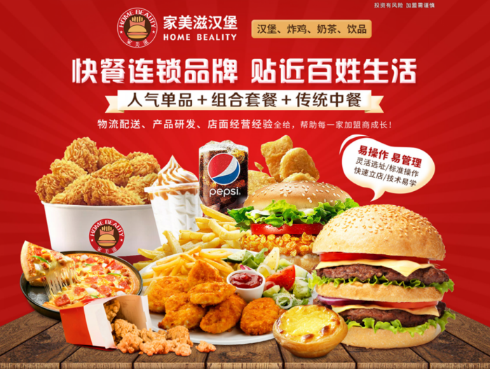 家美滋汉堡,快餐连锁品牌,贴近百姓生活,人气单品+组合套餐+传统中餐,全面满足消费者需求!