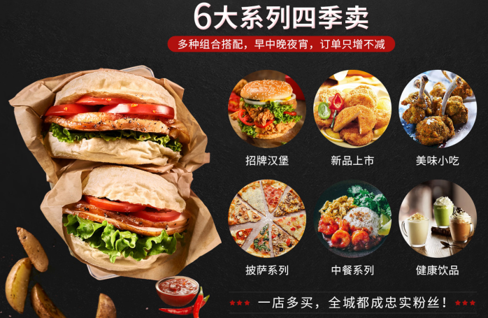 6大系列四季卖,千款美食敞开吃,多种组合搭配,早中晚夜宵,订单只增不减